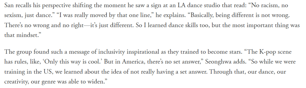 The interview paints a picture of what ATEEZ’s members are like when they’re not in “idol mode”, such as what they’re like when they’re getting prepped for a photoshoot or how they take breaks between the many activities they have each day. It also gives insight into their morals, inspiration, and how they work as a team, as well as their desire to remain authentic to themselves and their fans in an industry that so often tries to put artists into restrictive boxes.