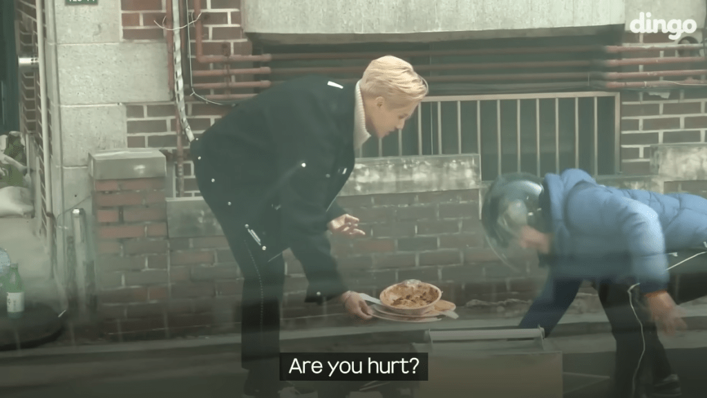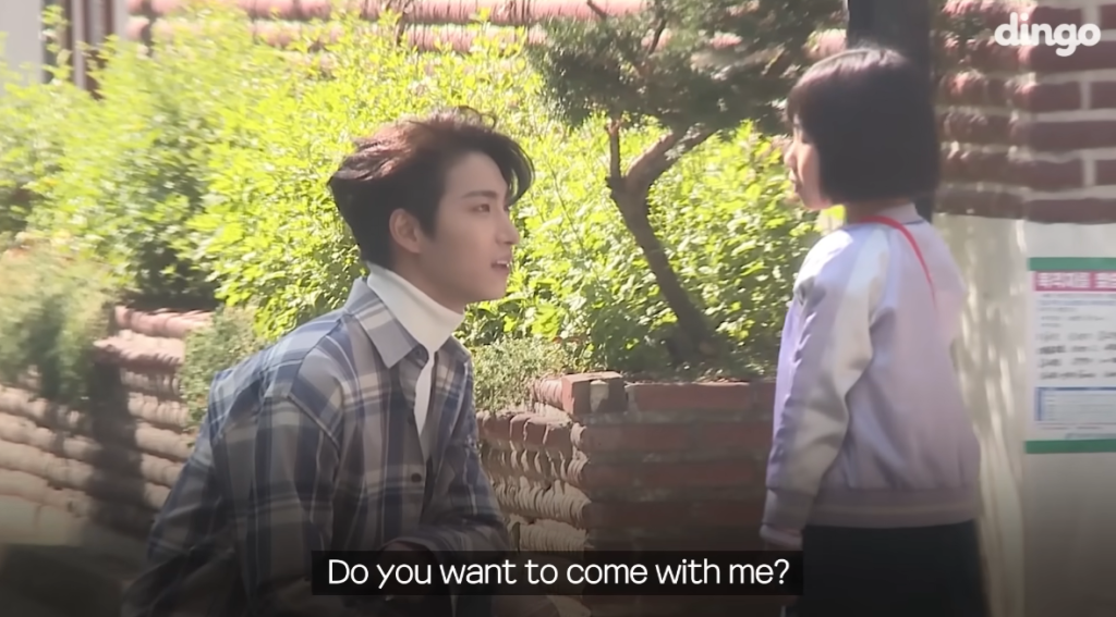 In the second “prank”, a little girl approaches Seonghwa and tells him that she got separated from her mom. He gently comforts her, getting down to her level to talk to her kindly and try to reassure her that things will be okay. After going through some options for how best to help her, he waits for her to consent to him taking her to a place where he believes they could get some help.