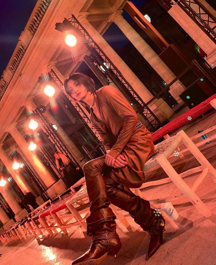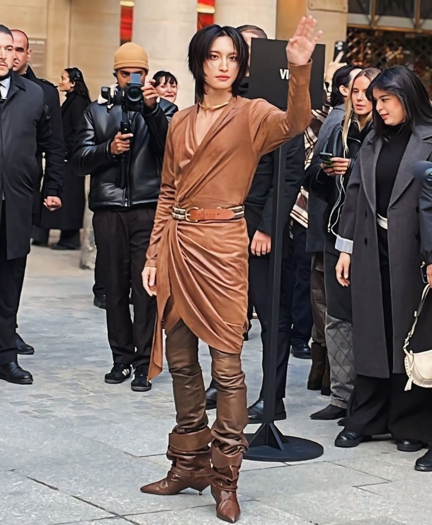 Not long after, jaws were on the floor as Seonghwa graced the Isabel Marant show in the evening. The powerful multi-talented member emerged from the stone arches donning the gorgeous, bronze Alixa wrap dress, Dolene lambskin leather pants, and a pair of raw umber-toned Edrika boots from the Winter 2024 collection paired with the Leda belt and golden Pio Choker Necklace. The look was a perfect genderless vibe while also resembling Star Wars costumes (specifically both Rey Skywalker and Obi-Wan Kenobi), both of which align with Seonghwa’s personal aesthetic and interests. ATINY were also left speechless by the conical, kitten heel that the boots sported, adding to the gender-blending of the piece as a whole.