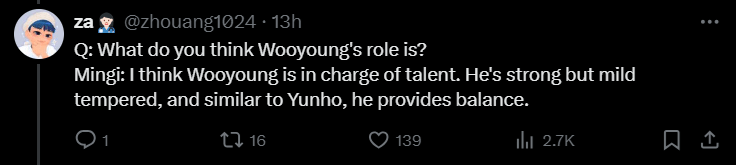 Mingi highlights Wooyoung’s talent and balance in the group.