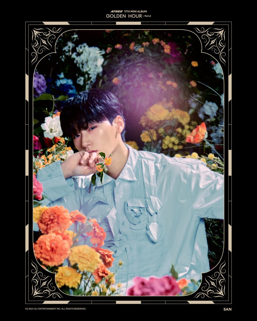 The first of the concept drops came from the To version that was released on November 3. Overall, each of the pictures portrayed a lot of beauty, life, and levity. The composition of the shots where each of them are surrounded and, in some cases, adorned with flowers manages to convey a softer, almost innocence with the fabrics. Each of the fabrics appear to be breathable in some capacity, between the mesh knit sweater Seonghwa is wearing to the cottony button-up San sports.