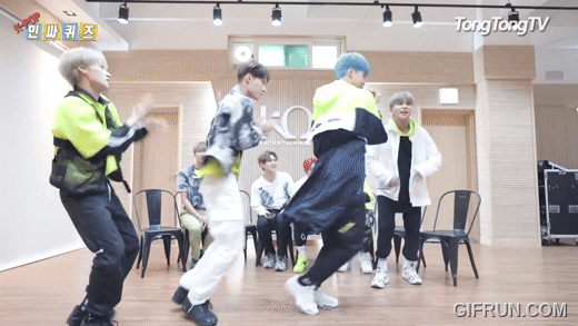 For the quiz game, there are three categories that the members have to identify K-Pop songs from: Identifying a small part of an album cover, recognizing English lyrics from a K-Pop song translated into Korean, and knowing the choreography of a song the best.