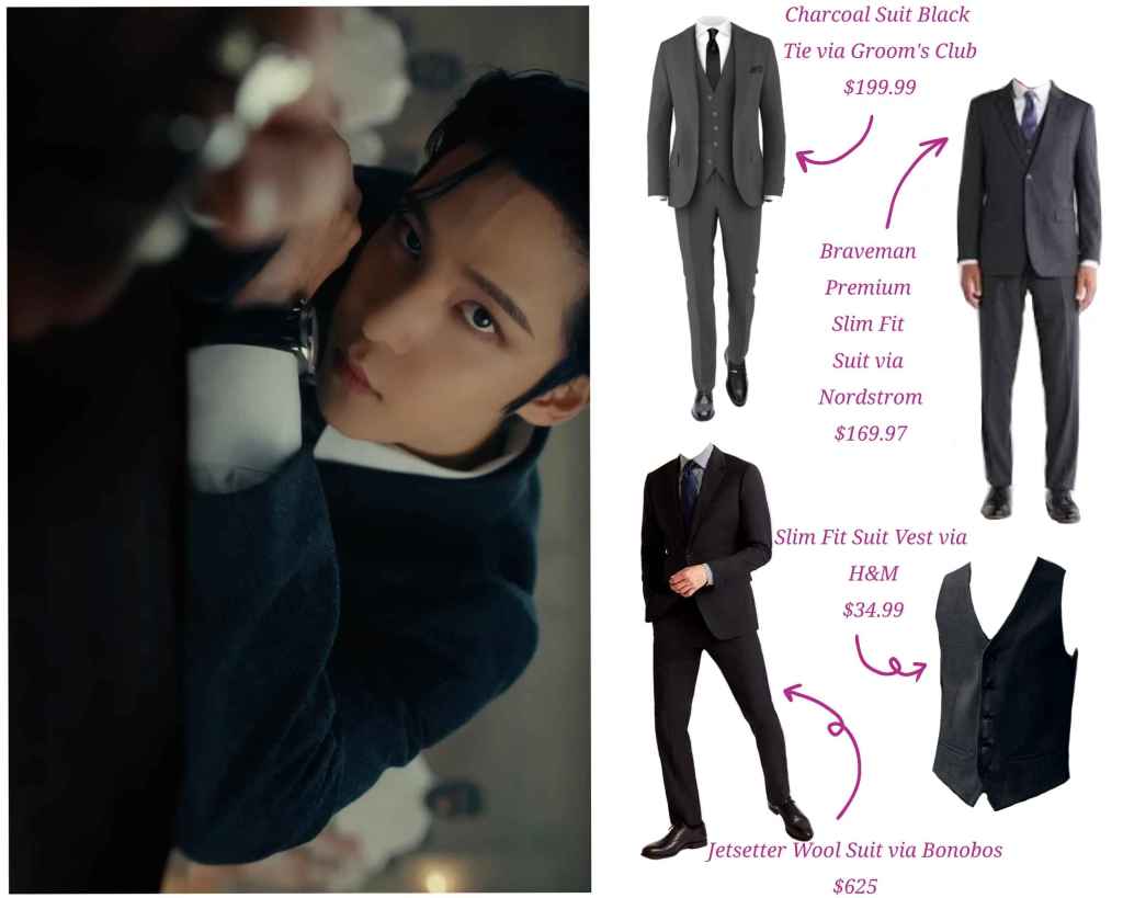 Looking over the outfit that Yunho is wearing, while the color in the MV reads as a black, other photoshoots and video recorded for short-form content puts the color into the charcoal-tones instead of a straight black. It even looks as though the waistcoat is a shade or so lighter than the pants in a few of the shots without the jacket, which lends credence to the options of mixing and matching your pieces. It also appears to be a finer fabric type than tweed or other coarser material, though it’s possible that it might be a wool blend. If you are wanting to have a full-set, you could look into the Braveman Premium Slim Fit suit, which is available through several vendors including Wal-Mart, Kohl’s, and Nordstrom Rack (the latter of which shows available online for as low as $169.97) or something from a men’s formalwear store like the Grooms Club Charcoal Suit Black Tie three-piece suit for $199.99. Other outlets like Bonobos can be a bit of a splurge, with the Jetsetter Wool Suit being a solid option. However, it would require you buying a waistcoat separately and that may lead to off-fits compared to the pants and jacket. This particular suit would set you back about $625, but when paired with the Slim Fit Suit Vest from H&M ($34.99) in the color Dark Gray really comes together.