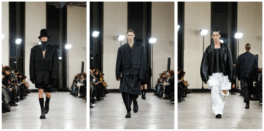Later on that day, Seonghwa made his appearance for the Songzio show in an outfit that, when framed with his gorgeous platinum hair, almost made him feel like a video game character. The all-leather look consisted of three separate looks from the Fall 2024 collection melded together, with the asymmetric jacket from Look 40, the wide-leg pants from Look 49, and the iconic mitter-inspired cut-up shirt plus the fur gloves from Look 42, which felt like the winning combination between the uniquely formless silhouette of the clothing mixed with the peek-a-boo of skin that you can glimpse at the right moments. The garments mesh well with each other, despite them not being a singular look. There was a chance that the layering of the articles would lose the intriguing elements amid the mass of fabric, yet there is still enough to be able to differentiate each article.